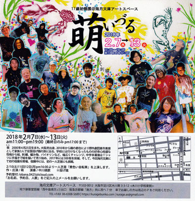 2018/02/06 萌17才!「萌えいづる」始まります・・・海月文庫 一年を通じて全国を巡業している野外劇団「楽市楽座」 そのメンバーの一人・・・萌17才! 「萌いづる」今日は搬入日です。 会期:2018.2/7(木)~2/13(火) 時間:AM11時~PM7時(最終日5時) ★作家在廊日 毎日1時~6時半迄 ◆会期中イベントのお知らせ◆ 一人芝居「黄色い自転車」:要予約(投げ銭) 2/10(土)残少 11(日)満席 12(月)満席 各日16時より 作品展の様子はスペース担当がFACEBOOKを随時更新。 新着本やWEBショップも古本担当が時々更新。 tagPlaceholderカテゴリ: 作品展, 古本, 2018年
